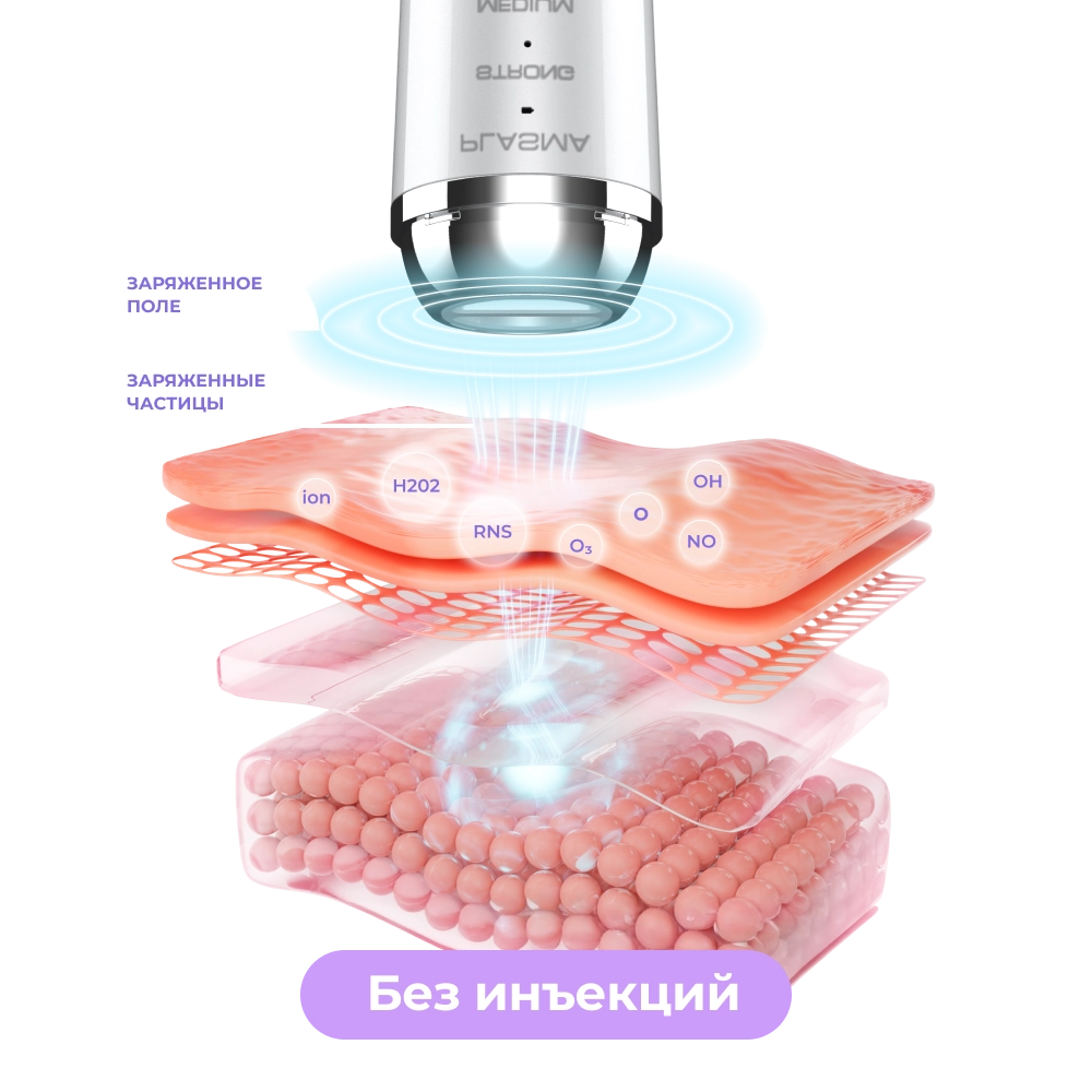 Энергия холодной плазмы (ионизованного газа низкой температуры до 40°), быстро распределяясь по поверхности кожи, способствует снижению количества бактериальных клеток, регенерации ткани и естественному синтезу коллагена и эластина. В домашних условиях прибор поможет добиться безинъекционного омоложения и косметологического ухода за распространёнными проблемами кожи — акне, угревой сыпью и другими видами воспалений. Использование плазма-аппарата курсами сокращает морщины, выравнивает цвет лица, шлифует рубцы и следы постакне, тем самым деликатно восстанавливая однородную текстуру дермы.